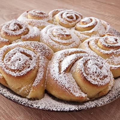 La torta delle rose è un dolce di pasta lievitata tipo pasta brioche che viene farcita con una crema di burro e zucchero limpasto viene arrotolato e poi tagliato a pezzetti che assumono una forma di boccioli di rose da lì il suo nome.